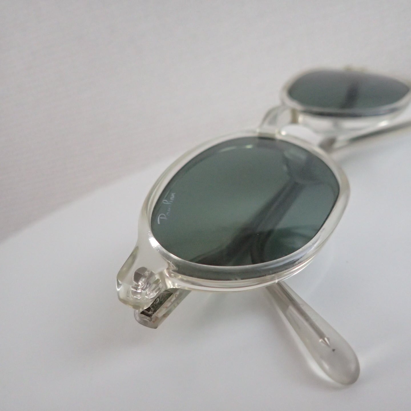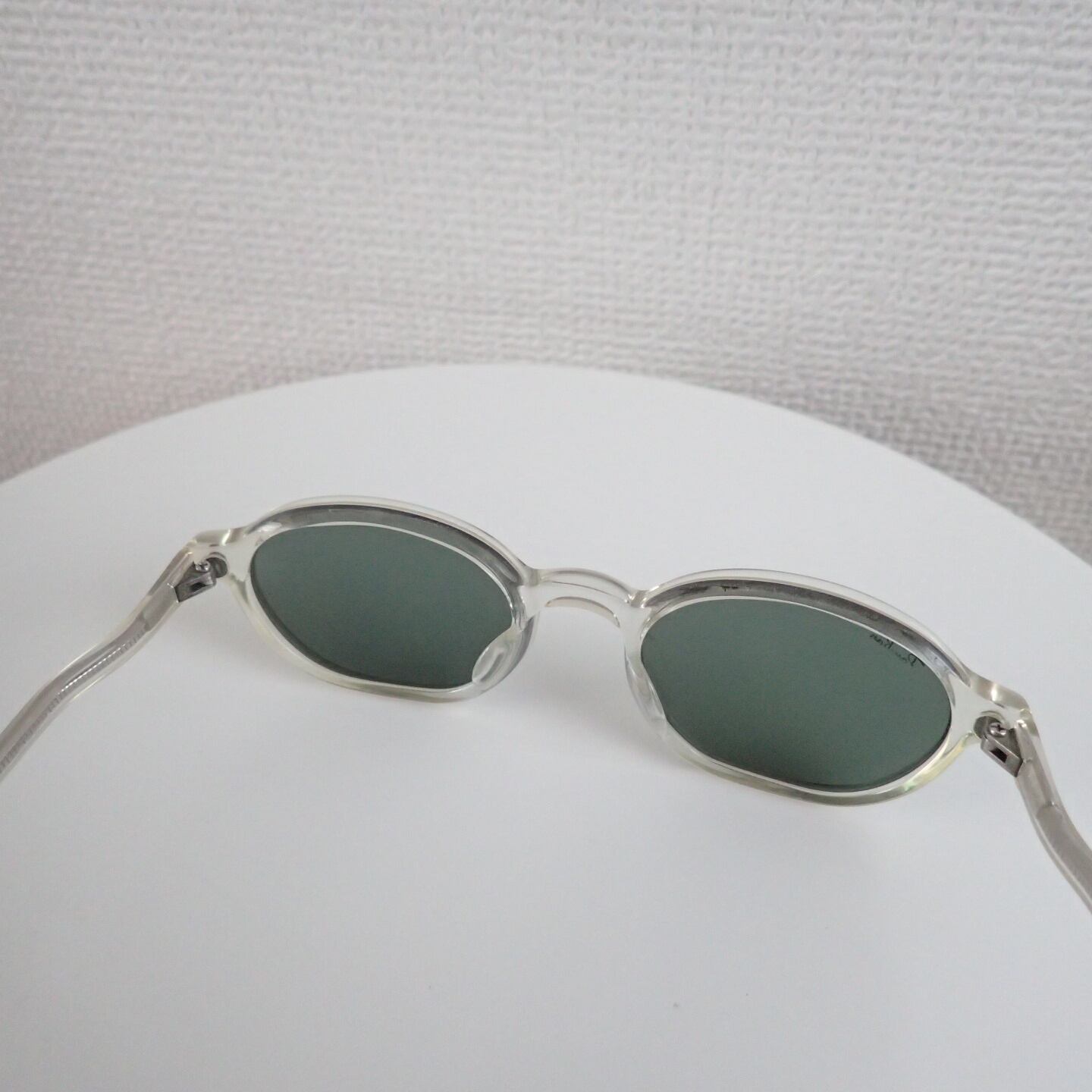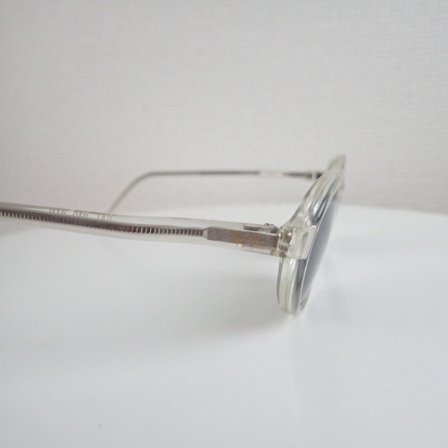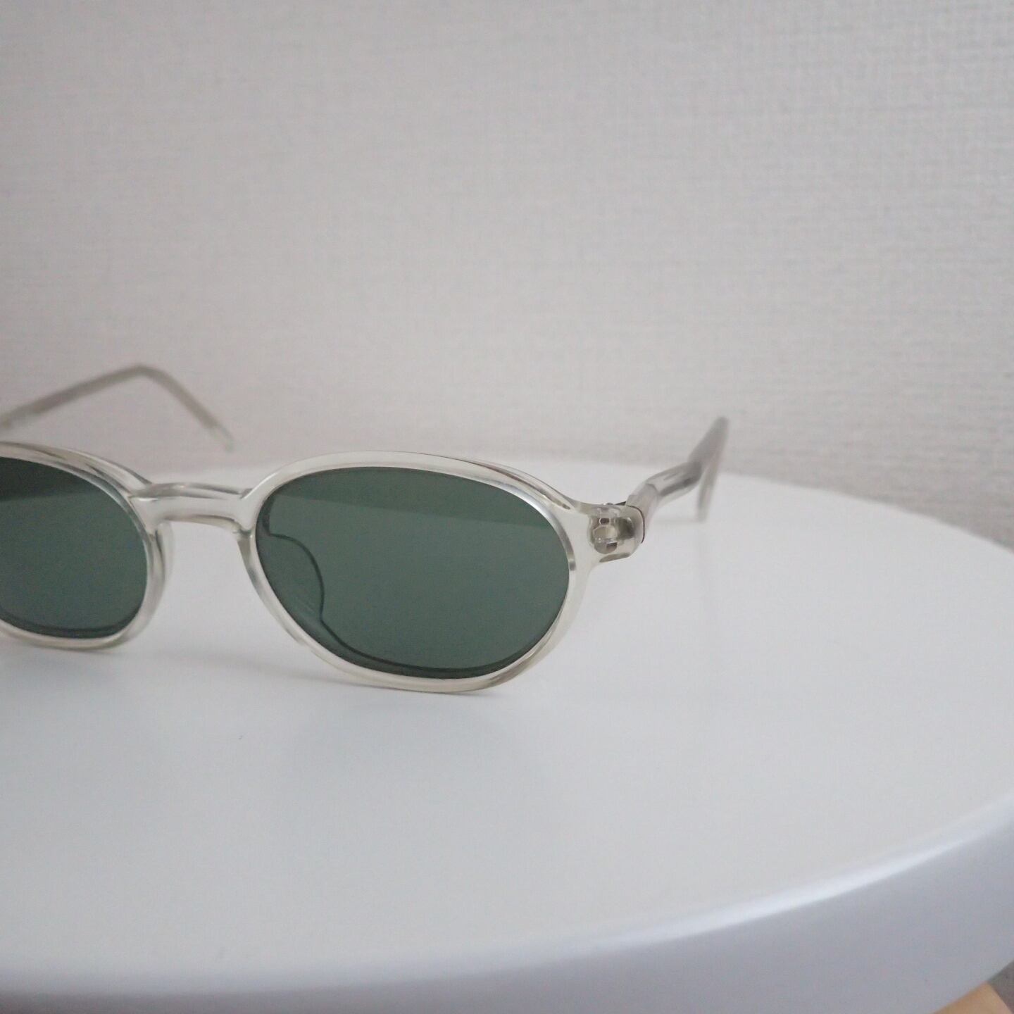 サイズ感はコンパクト。細身のリムに、クリアフレーム×G-15ガラスレンズの組み合わせ。シンプルに見えて、じわっと個性が光ります。